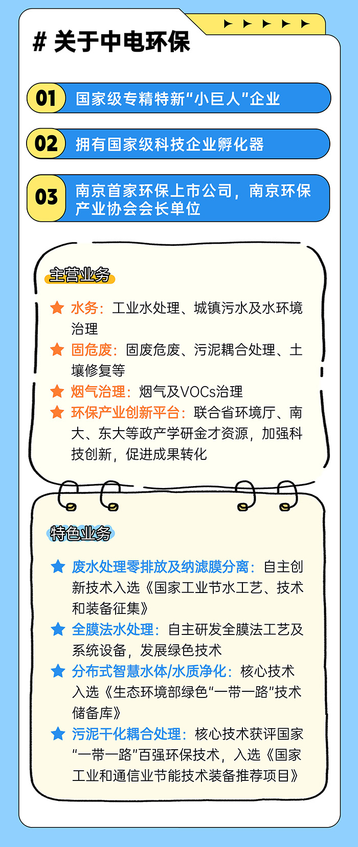 中電環(huán)保股份有限公司是南京市首家環(huán)保上市公司(股票簡稱:中電環(huán)保,股票代碼:300172),南京環(huán)保產業(yè)協會會長單位,國家級聯盟理事長單位,是生態(tài)環(huán)境治理服務商,主營(3+1):水務、固危廢、煙氣治理及產業(yè)創(chuàng)新平臺,包括:工業(yè)水處理、污水處理及水環(huán)境綜合治理;固危廢土壤、污泥餐廚垃圾處理;煙氣及VOCS治理;智慧環(huán)保;高端裝備等。